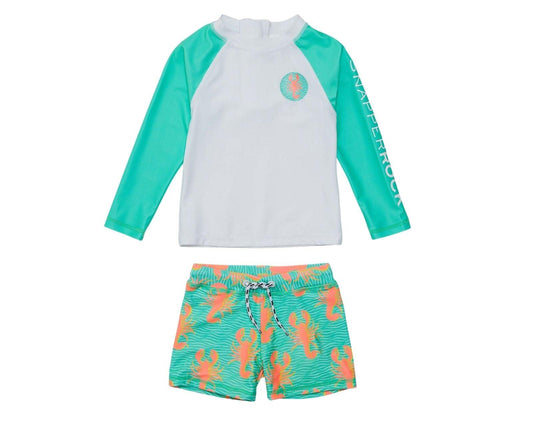 Your little one can swim in style without burning in the UPF 50+ Top & Swim Shorts Set. Made with non-toxic 50+ UPF fabric to keep little bodies sun-safe all day long (wet or dry), this two-piece rash guard set, complete with a long-sleeve and swim shorts, provides the sun...