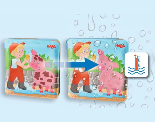 This Farm Animals Color Changing Bath Book provides entertainment during bath time! The book's theme is a big washing day at the farm, and when the pages come into contact with warm water, the "dirt" spots on the various pages wash away with warm water like magic, and return again...