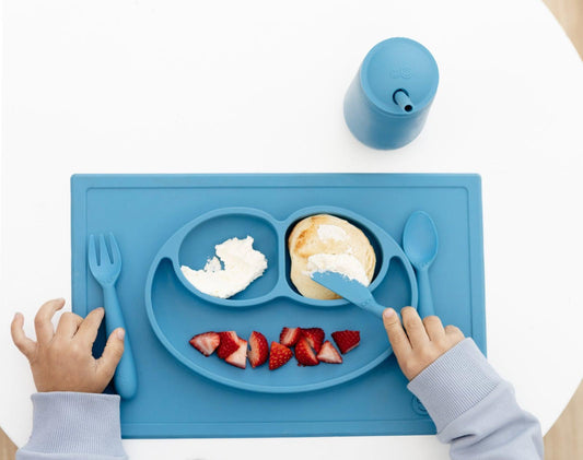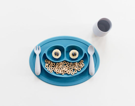 Combination plate and placemat, the ezpz Happy Mat provides everything your child needs for a mess-free and balanced meal. The Happy Mat plate contains three compartments, and the mat suctions to any smooth surface to reduce tipped bowls and help toddlers and preschoolers gain confidence with self-feeding.