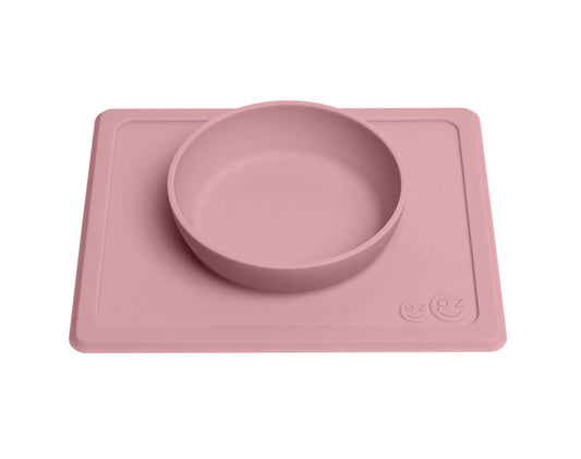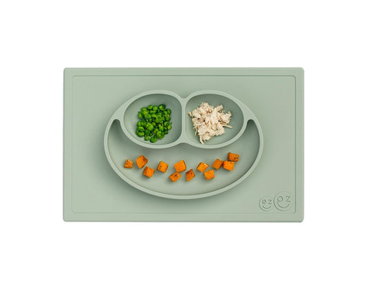 Combination plate and placemat, the ezpz Mini Mat provides everything your child needs for a mess-free and balanced meal. The Mini Mat plate contains three compartments, and the mat suctions to any smooth surface to reduce tipped bowls and help infants and toddlers gain confidence with self-feeding.