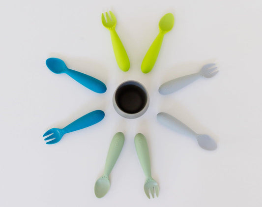 Ease into self-feeding with the Mini Utensils set from ezpz. Just the right size for little hands and mouths, this non-slip fork and spoon allow for easy scooping and piercing. Sensory bumps and a raised rim provide sensory awareness!