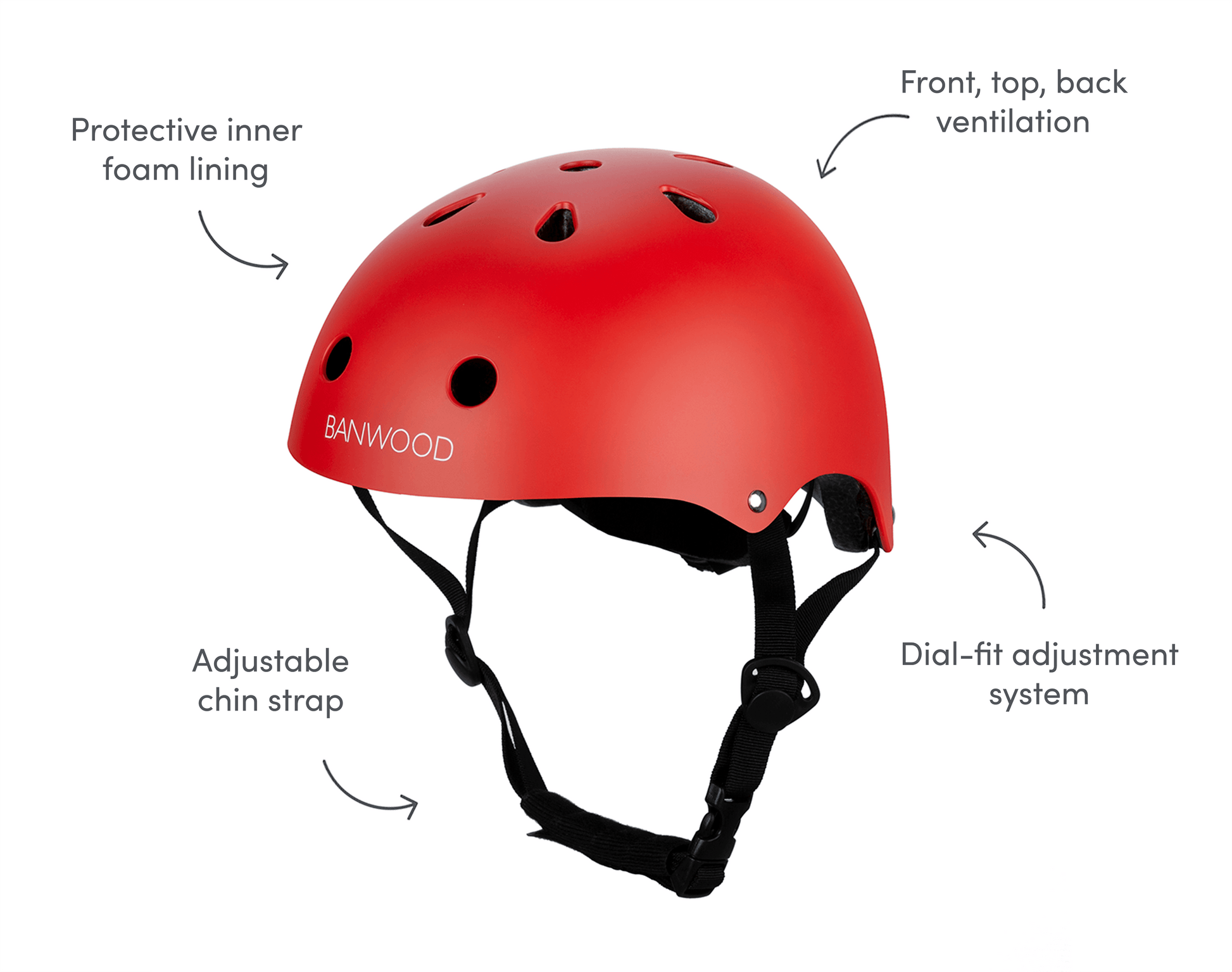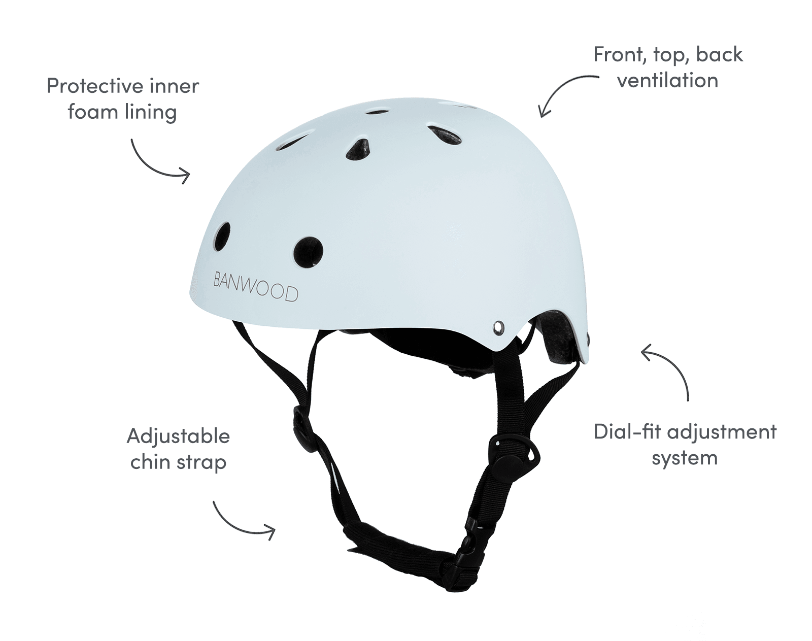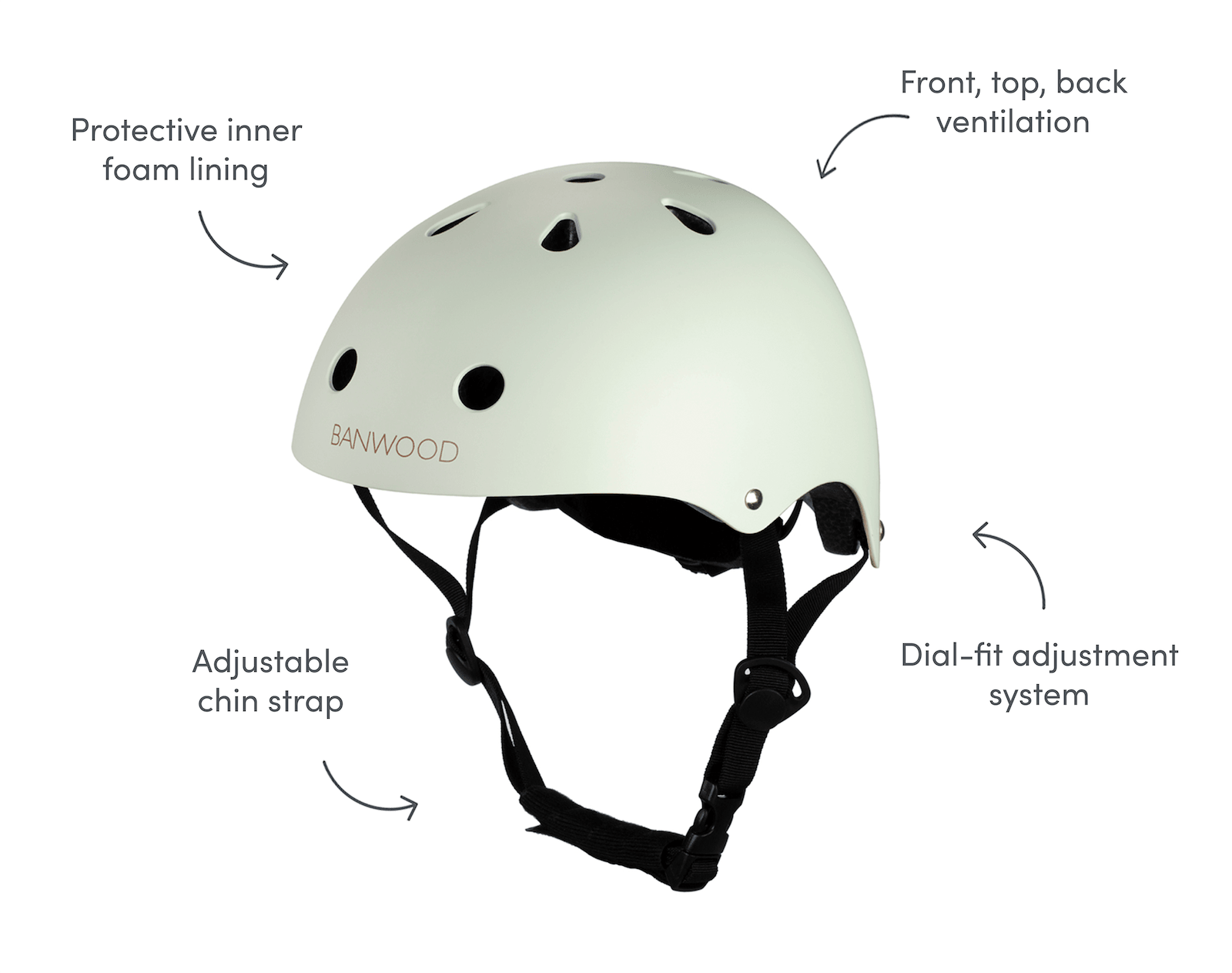 Make safety stylish with the Classic Helmet from Banwood. Made with a durable ABS outer shell and soft inner foam, the Banwood Helmet offers comfortable and durable protection for your little one. A dial-fit adjustment system together with an adjustable chin strap allows for the perfect fit to your child's head! Classic colors and a matte finish make this the perfect everyday helmet.