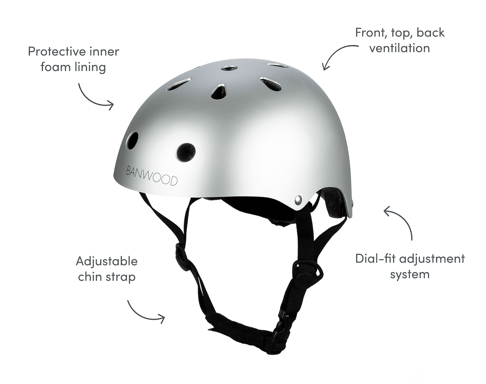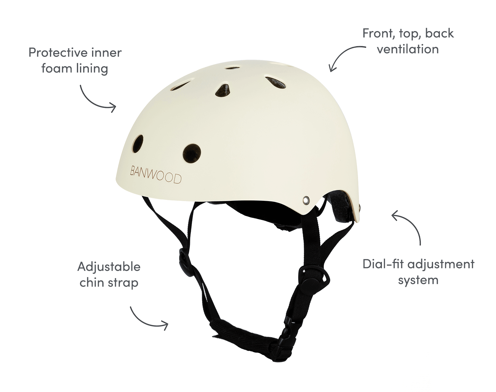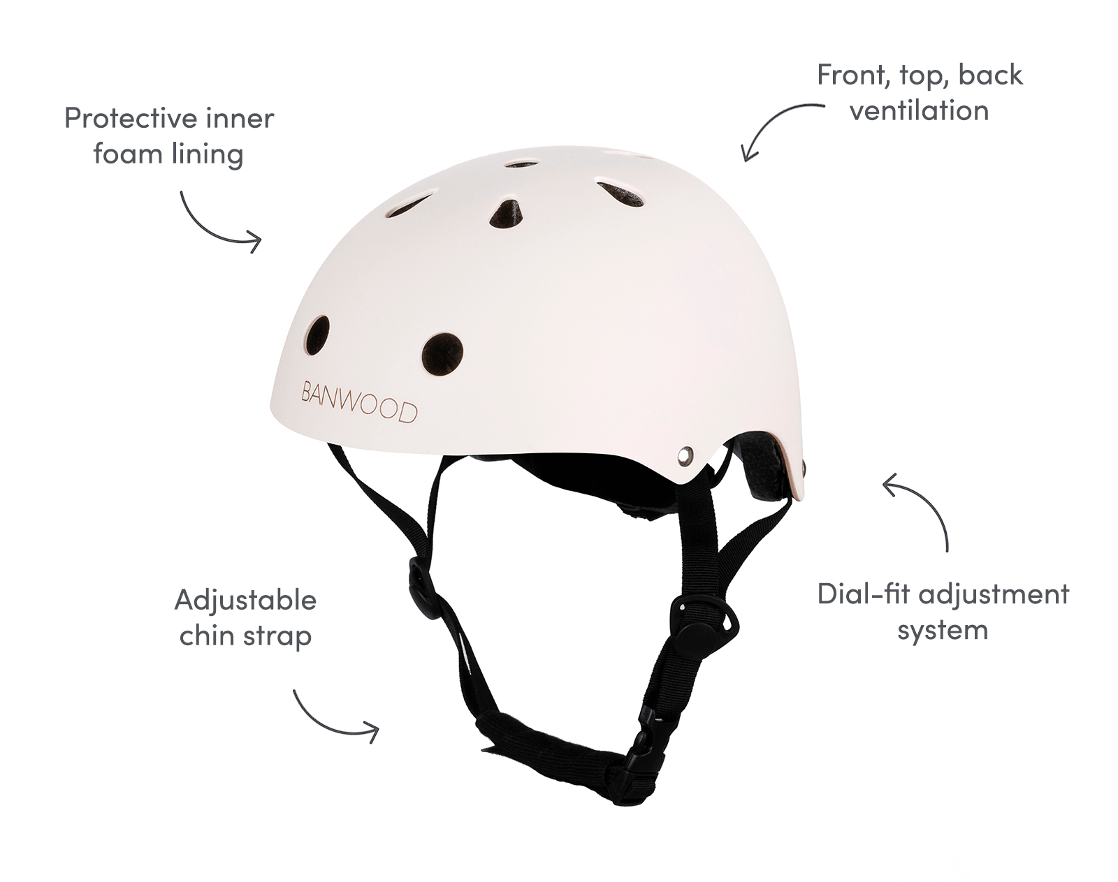 Make safety stylish with the Classic Helmet from Banwood. Made with a durable ABS outer shell and soft inner foam, the Banwood Helmet offers comfortable and durable protection for your little one. A dial-fit adjustment system together with an adjustable chin strap allows for the perfect fit to your child's head! Classic colors and a matte finish make this the perfect everyday helmet.