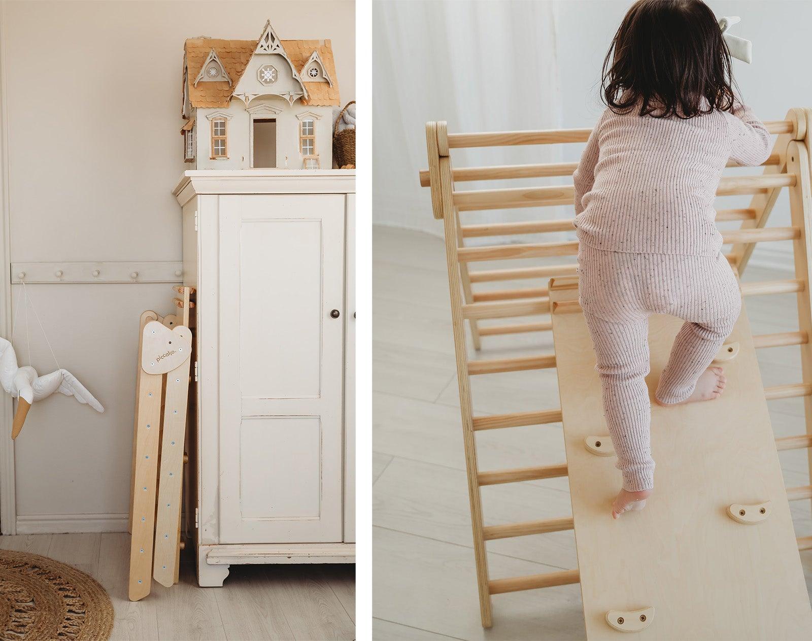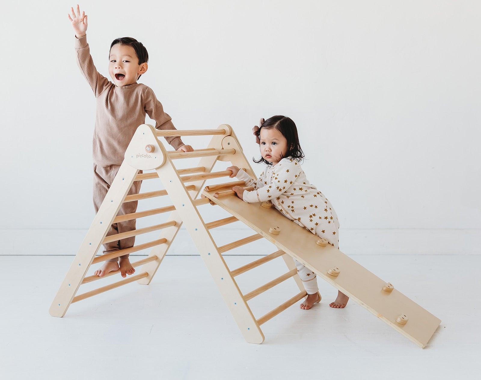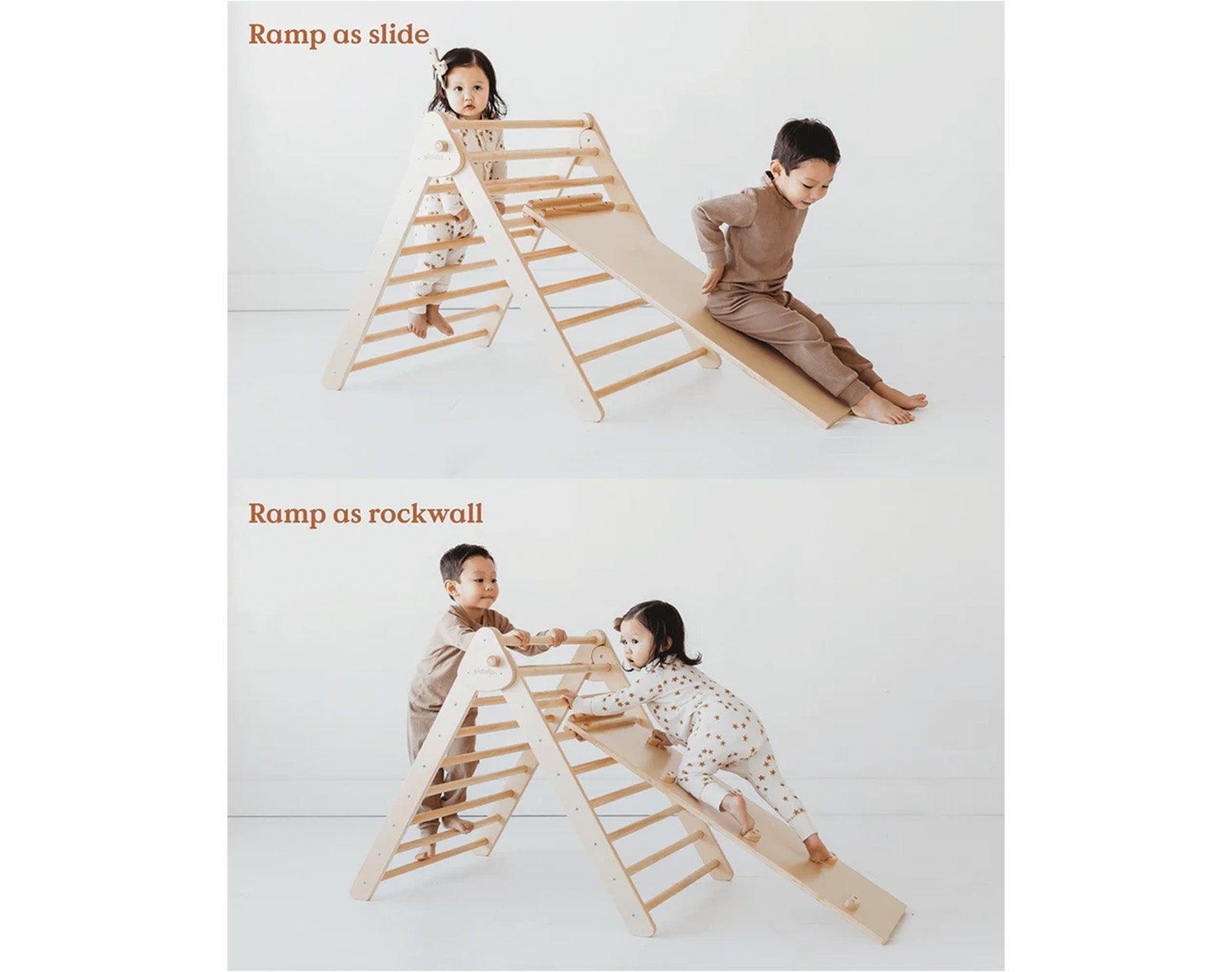 The Climber Pikler Triangle Set is designed to provide a safe space for your little ones to practice their climbing skills! Including the Pikler Triangle and Reversible Rockwall/Slide Ramp, your littles are sure to be entertained for endless hours of imaginative fun and become little climbers in no time! The folding feature for easy storage makes it a great indoor play item for the home.