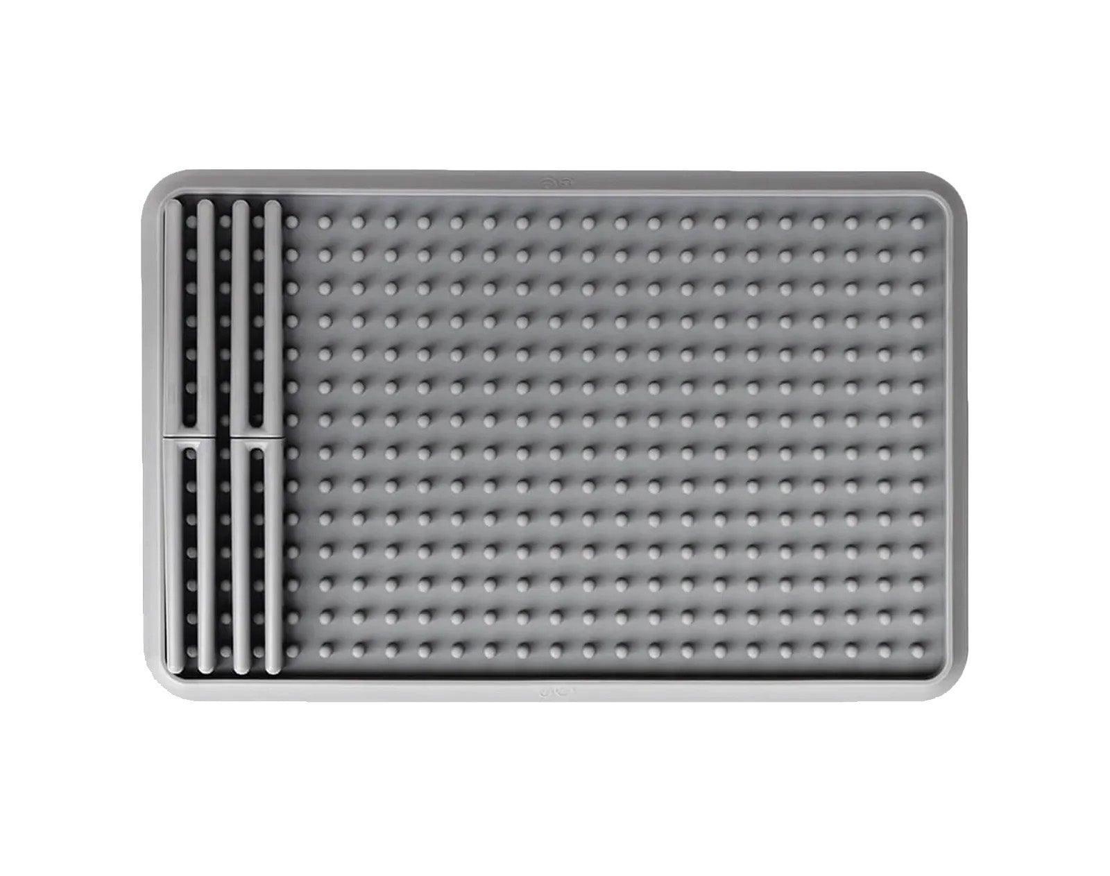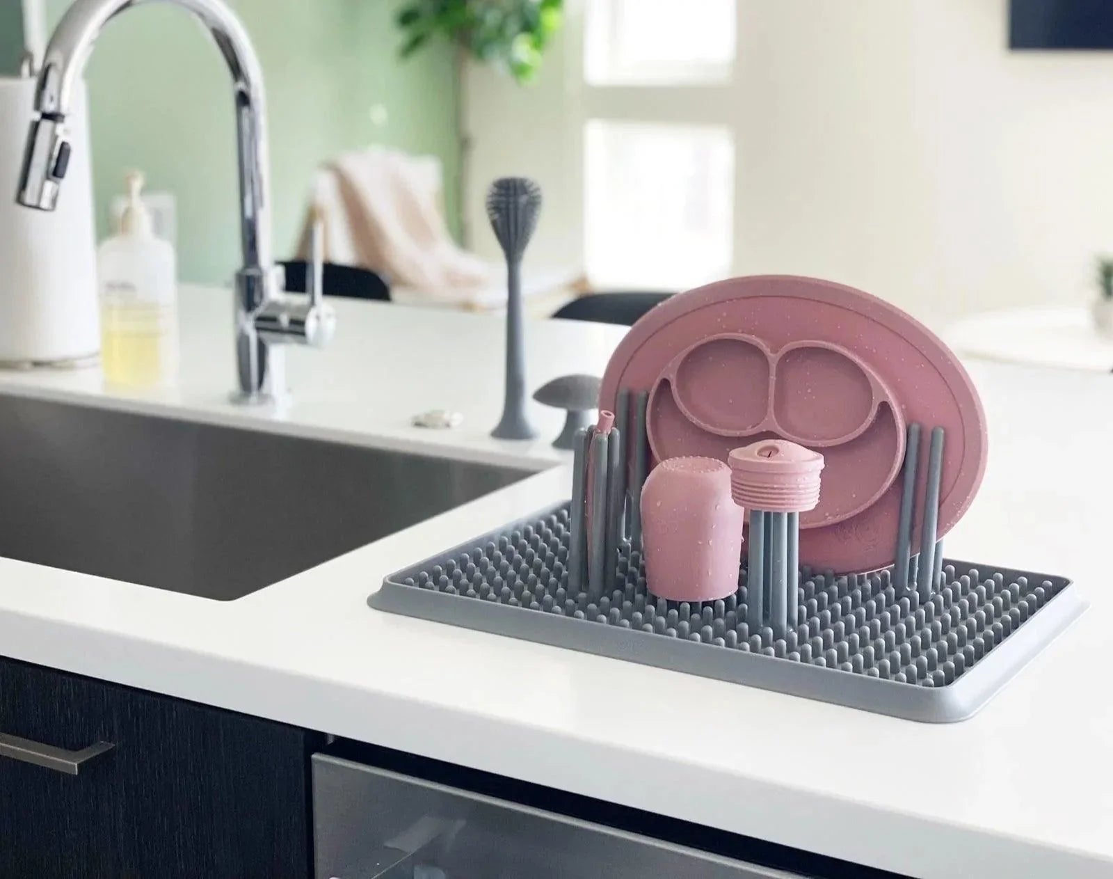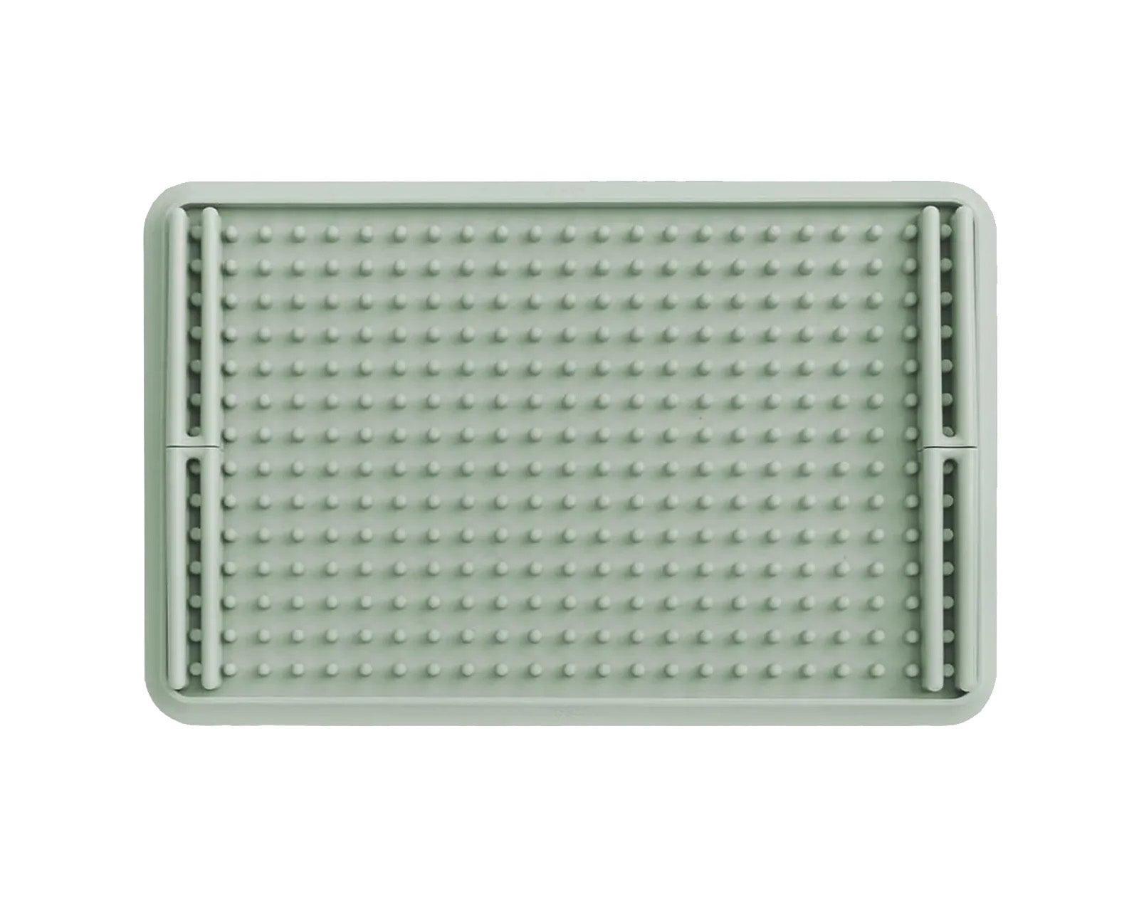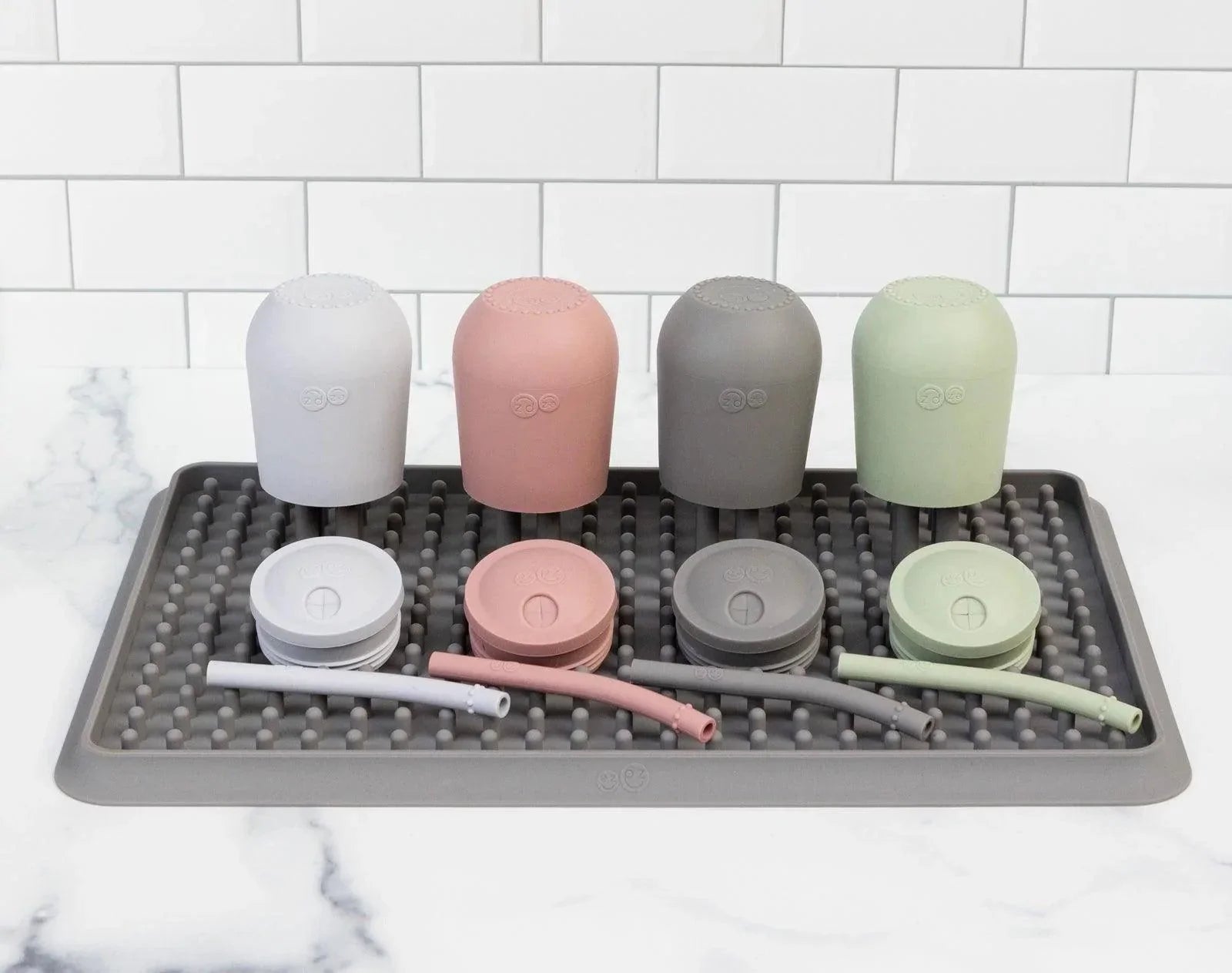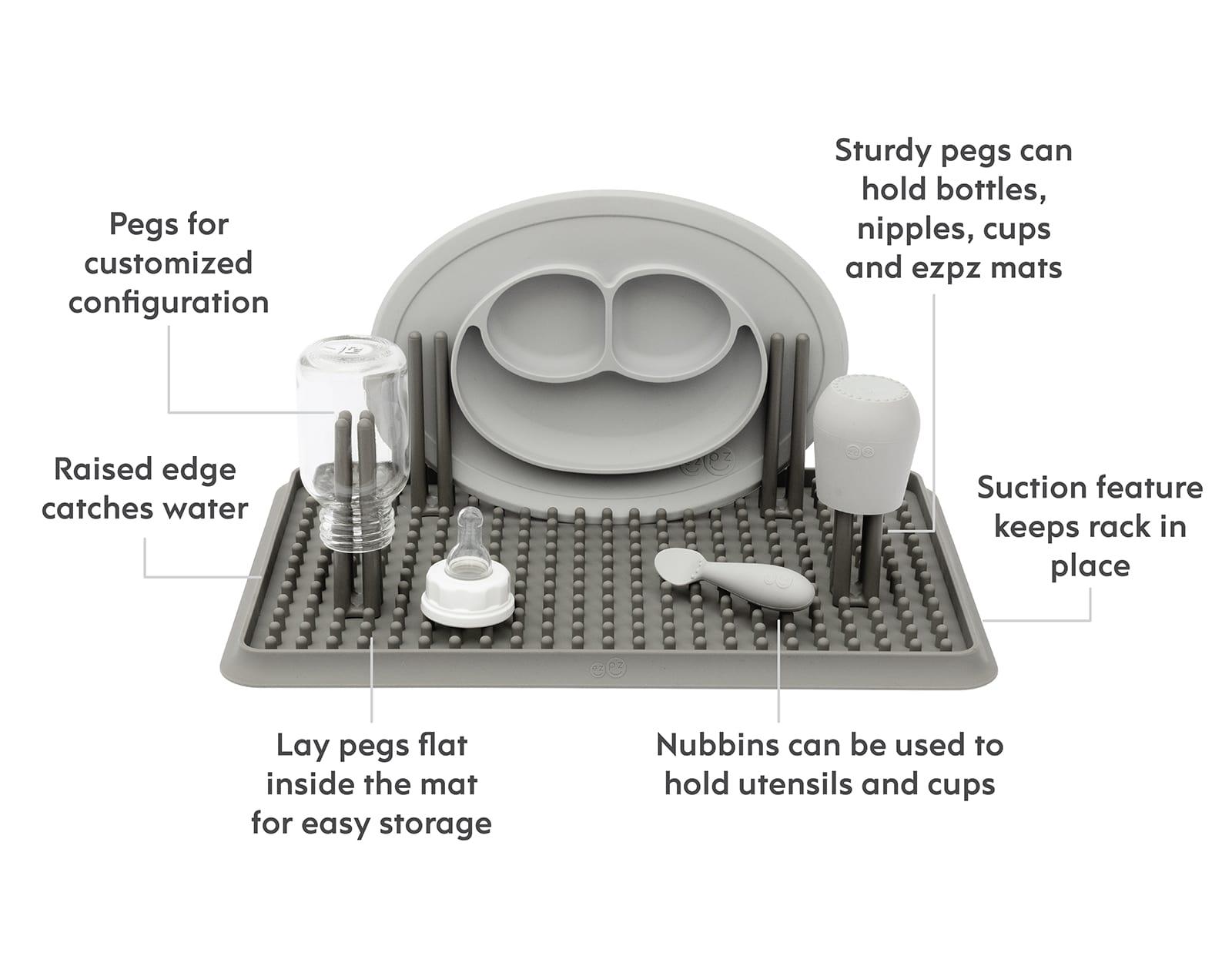 Dry all of your little one's feeding accessories in style with the ezpz Drying Rack. Made of silicone and complete with removable pegs, this drying rack is customizable and can hold bottles, nipples, cups, and other kitchen items. A suction feature keeps the drying rack from sliding, and a raised edge catches water to keep your counters clean!