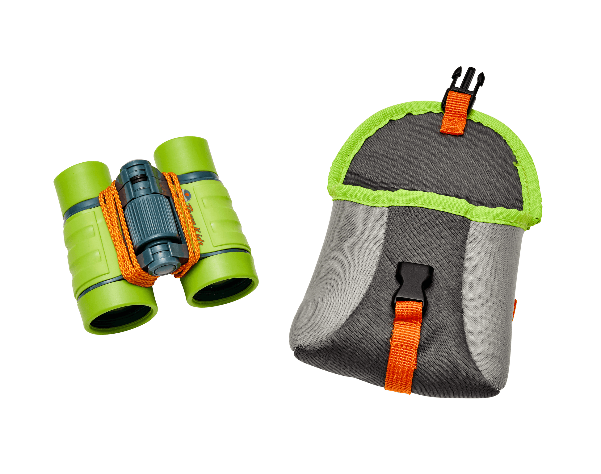 Watch birds or spot a deer with these expertly-crafted binoculars that magnify 4x! Packaged in a neoprene shoulder bag with a snap fastener and an aluminum carabiner, these binoculars feature rubberized lens guard bumpers, soft and adjustable eye-piece spacing, a focus knob, and a break-free neck strap for a safe and fun viewing experience.