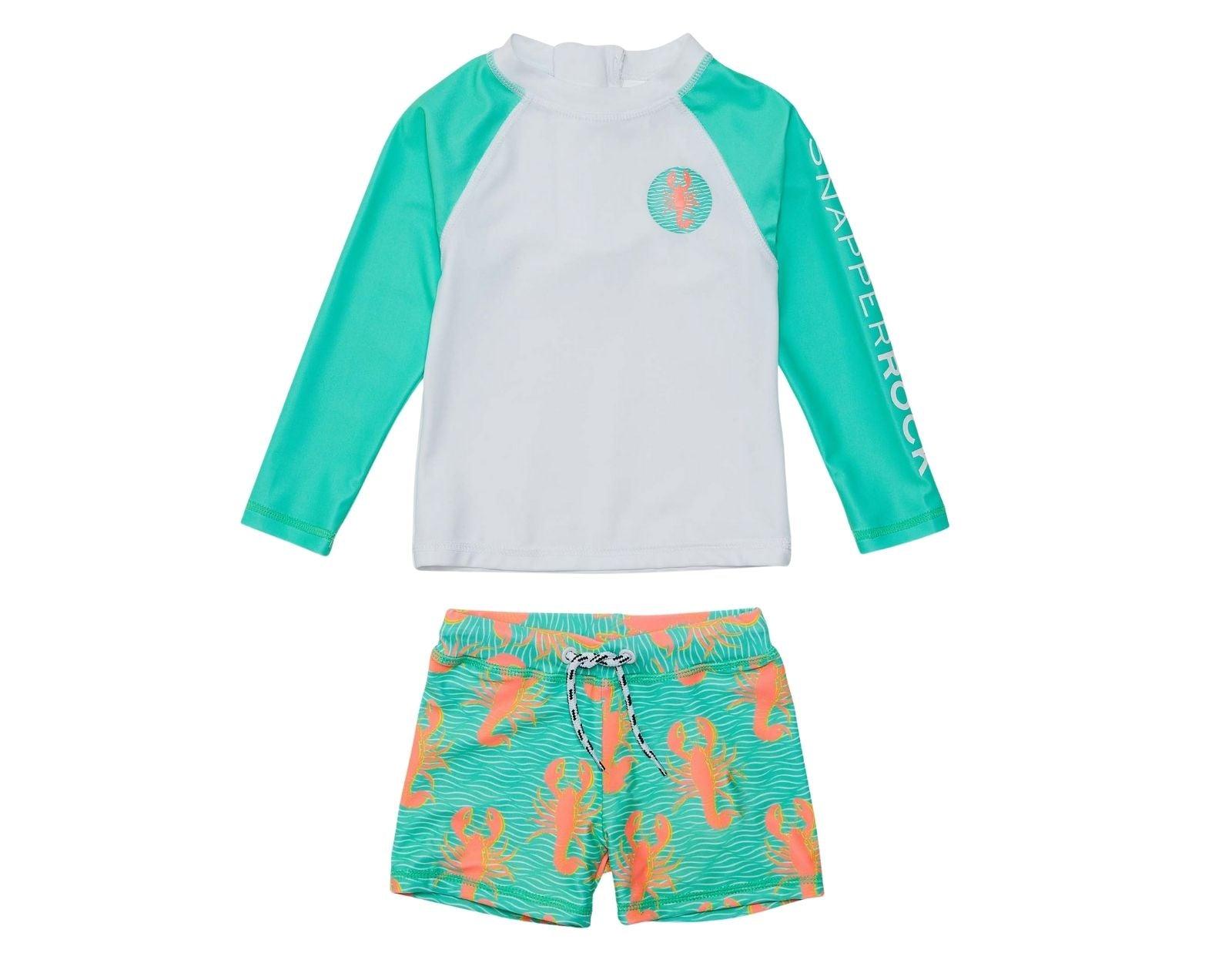 Your little one can swim in style without burning in the UPF 50+ Top & Swim Shorts Set. Made with non-toxic 50+ UPF fabric to keep little bodies sun-safe all day long (wet or dry), this two-piece rash guard set, complete with a long-sleeve and swim shorts, provides the sun coverage your little one needs! The set features: