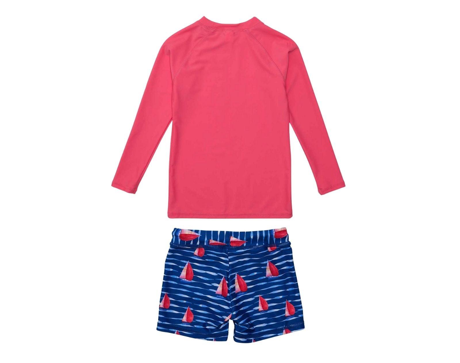 Your little one can swim in style without burning in the UPF 50+ Top & Swim Shorts Set. Made with non-toxic 50+ UPF fabric to keep little bodies sun-safe all day long (wet or dry), this two-piece rash guard set, complete with a long-sleeve and swim shorts, provides the sun coverage your little one needs! The set features: