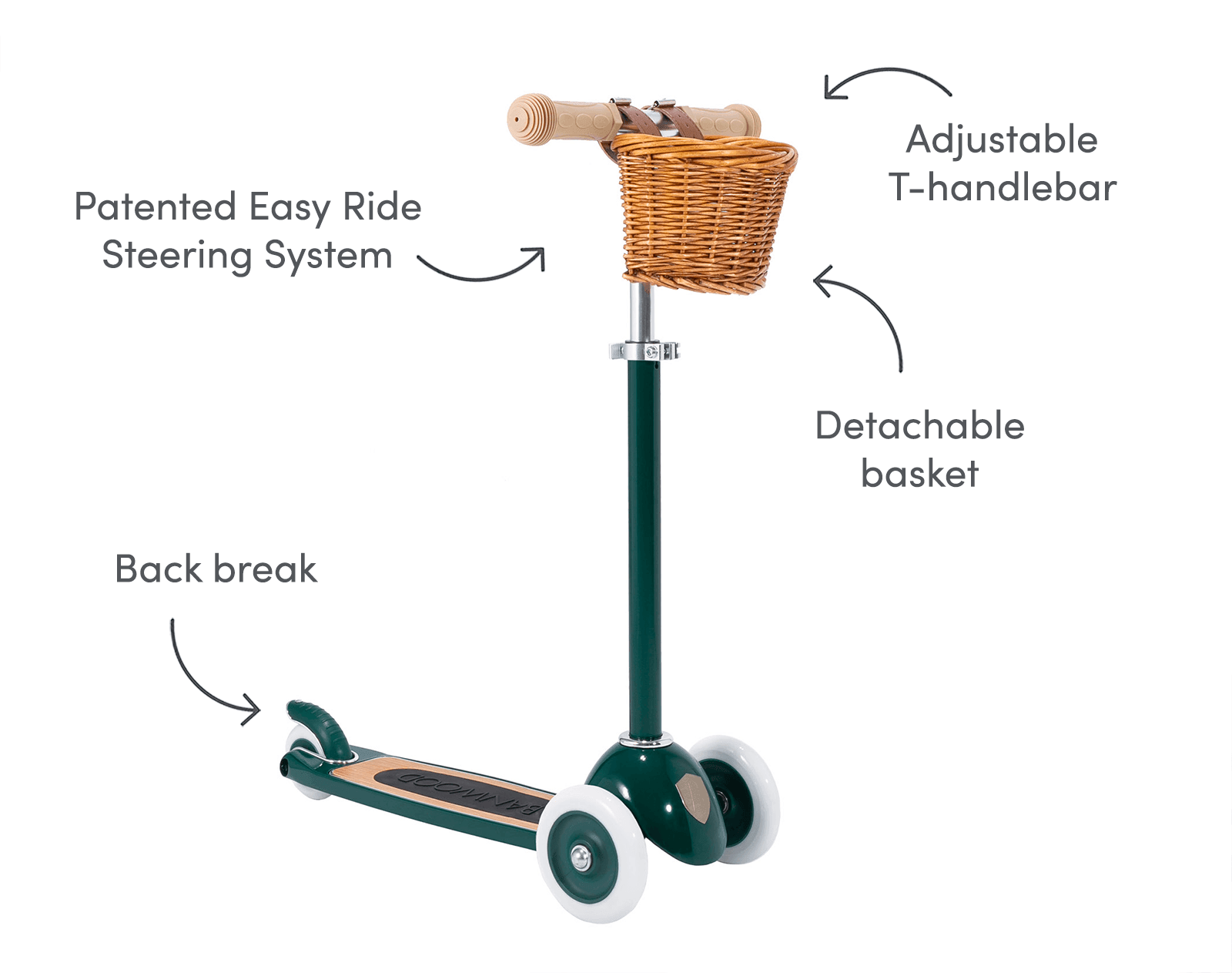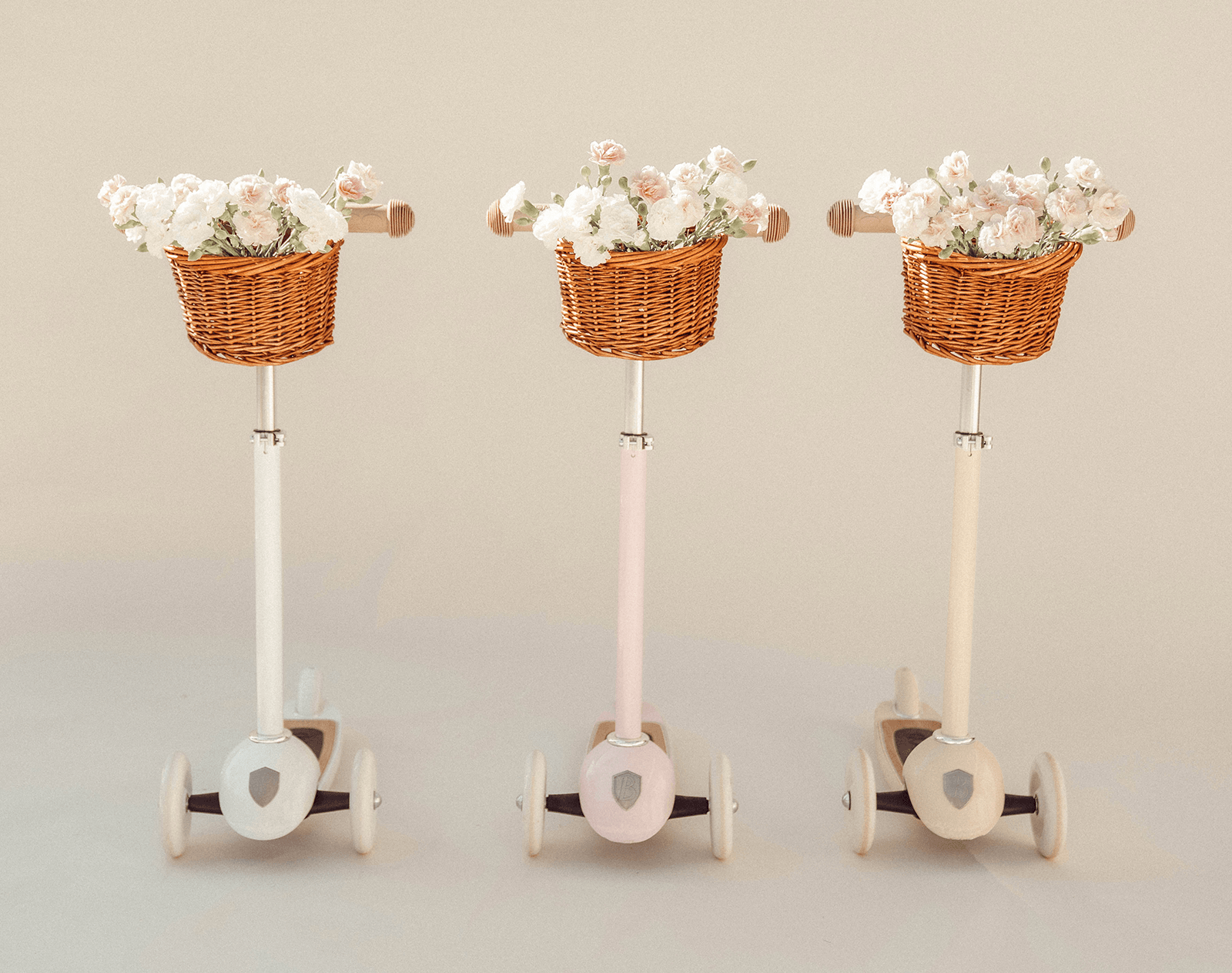 Scoot in style with the Banwood Three Wheel Scooter! Designed with a lightweight frame and unique angle control system, this scooter is easy to steer and transport. The 3 wheel kick scooter is equipped with a T-handlebar that can be gradually adapted to three different levels as your child grows. Rubber grips and a wide platform offer a comfortable and safe hold for your little one as they work on their balance and coordination. Unique colors and a removable wicker basket make this a timeless and functional addition to your little one's playtime!