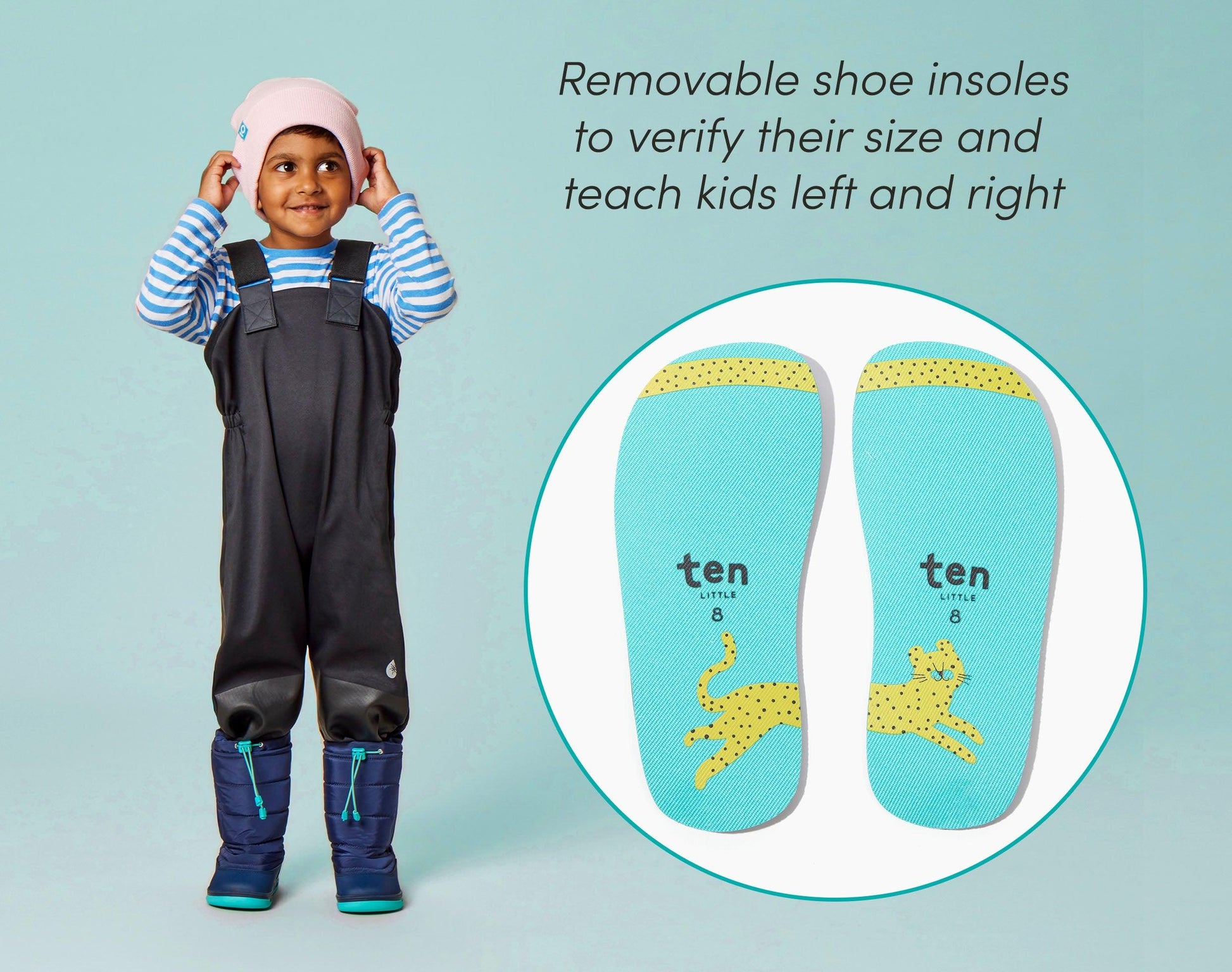 • Removable insoles: Help teach left from right and make it easy to check your child’s size
