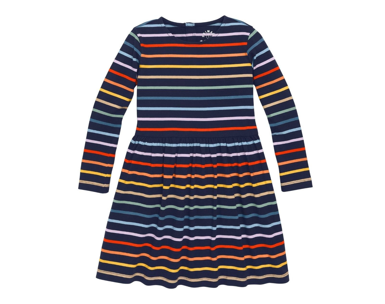 Your little one will love this Long Sleeve Pocket Dress, featuring fun rainbow stripes and the perfect skirt for twirling! Made from 100% cotton jersey and pre-washed to minimize shrinkage, this dress is incredibly soft, breathable, and durable! The dress is hemmed above the knee and true to size with room to grow, and features a neck button for easy dressing and side pockets for storing treasures!