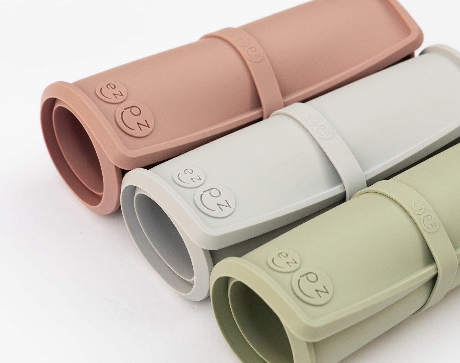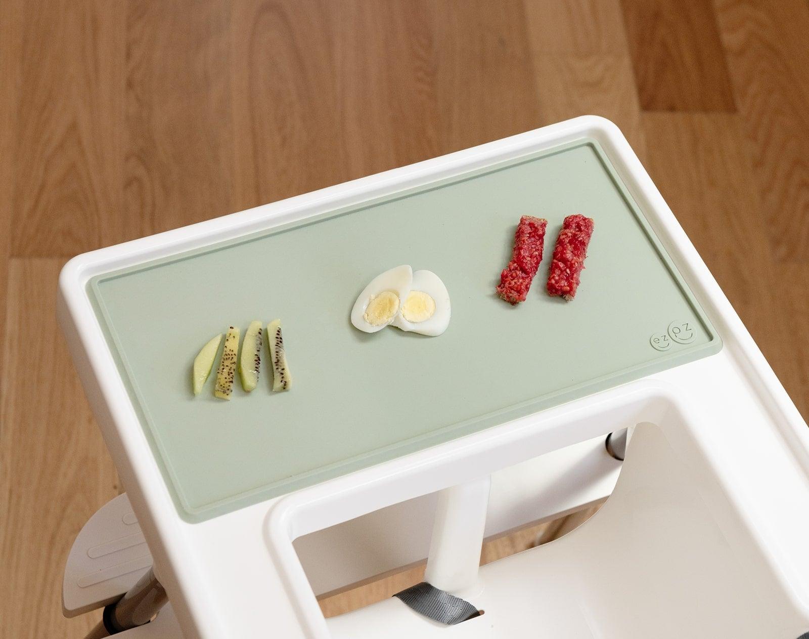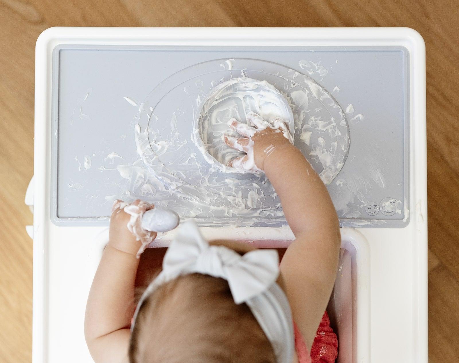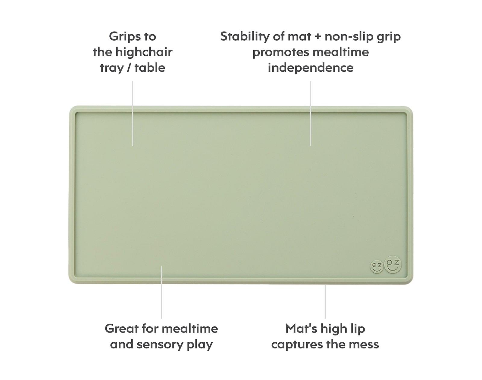 The Tiny Placemat is a non-slip, silicone placemat that fits on most highchair trays and is great for mealtime and sensory play. The mat's high lip captures the mess, and the mat comes with a silicone travel band which allows you to roll-up the mat and use it on the go!