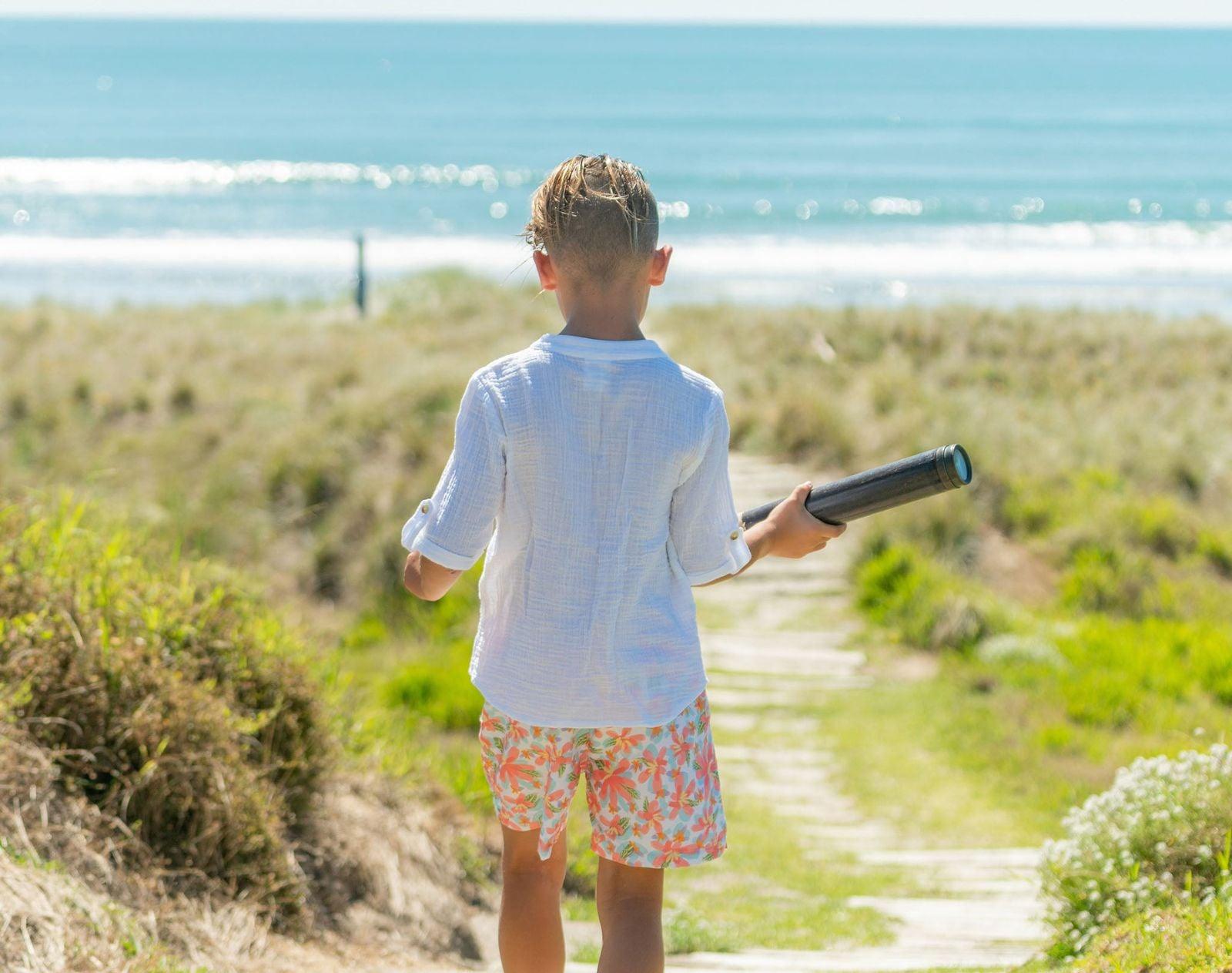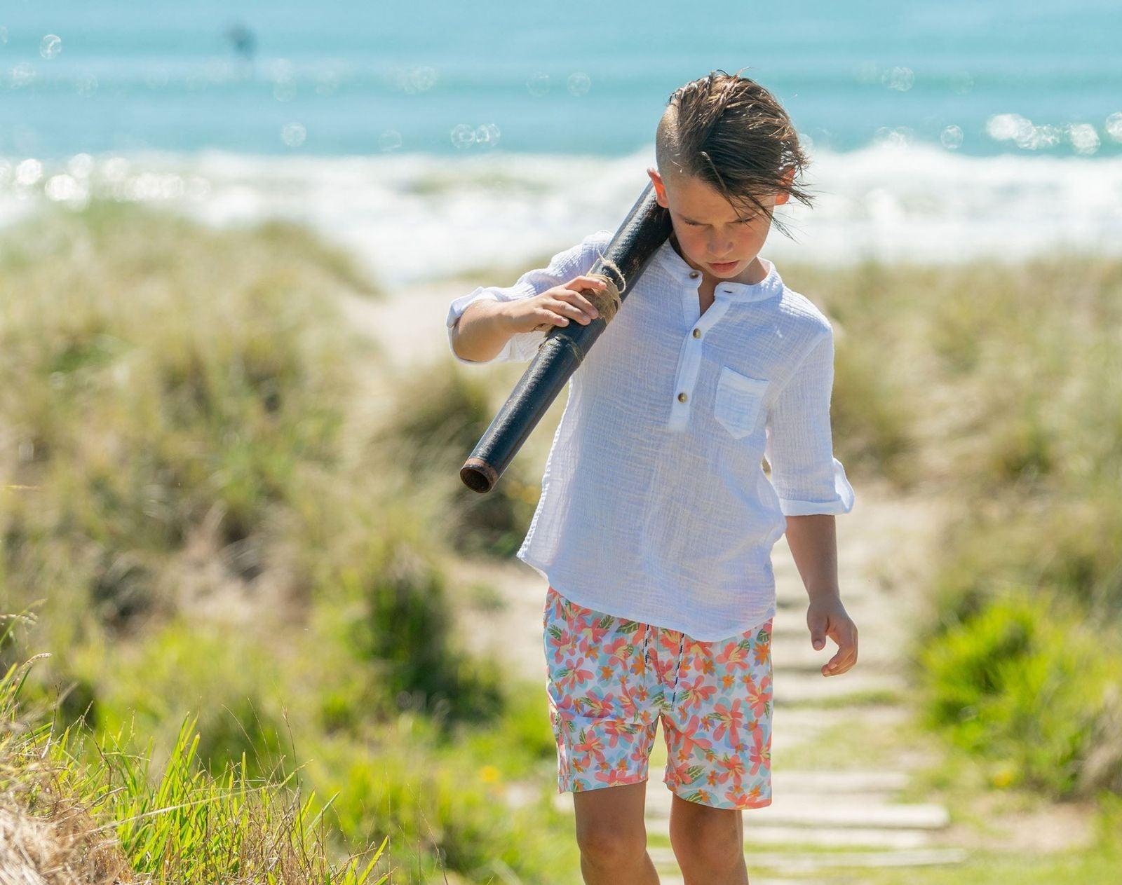 From sun to saltwater, these floral and comfy UPF 50+ Swim Shorts can handle it all! Made with a lightweight, sustainable non-toxic 50+ UPF quick-drying fabric to keep little bodies sun-safe all day long (wet or dry), the shorts are breathable with a mesh lining and feature velcro side and back pockets to secure any hidden treasures your little sandcastle builder may find. The shorts have a relaxed fit hitting just above the knee for extra sun coverage, and also have an adjustable waistband for maximum comfort with a functional drawstring to help hold them securely in place.