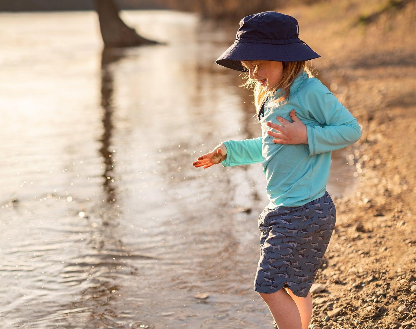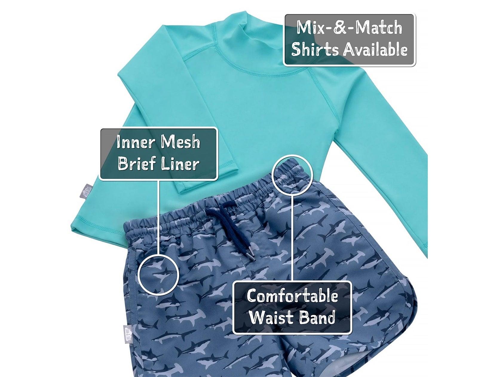 From sun to saltwater, these quick-dry UV Swim Shorts can handle it all! Made with an all-natural, non-toxic 50+ UPF lightweight aqua-dry fabric to keep little bodies sun-safe all day long (wet or dry), the shorts are water repellant and are soft, stretchy and breathable with a mesh brief liner. They have a relaxed fit hitting just above the knee for extra sun coverage, and also have an adjustable, elastic waistband for maximum comfort with a functional drawstring to help hold the shorts securely in place.