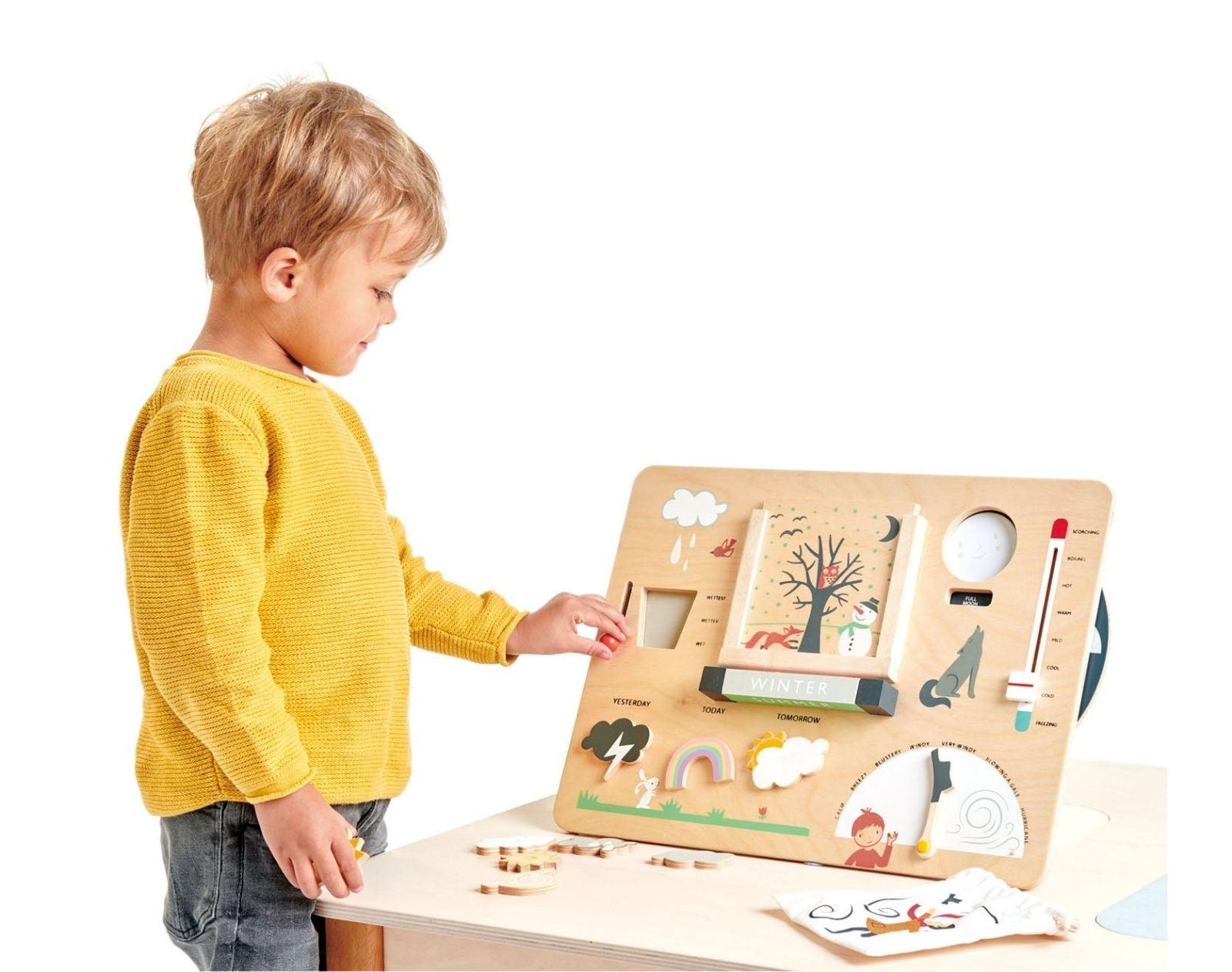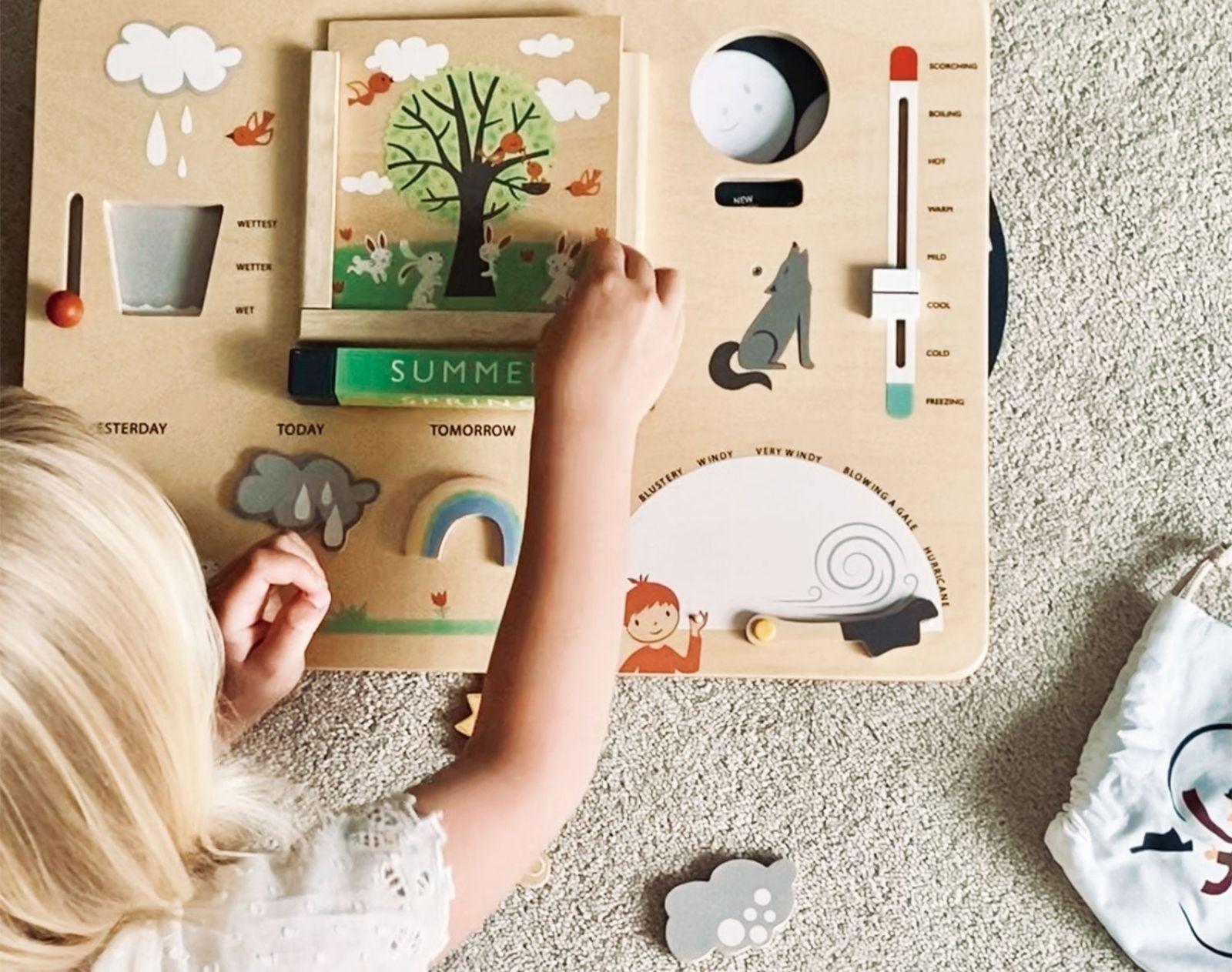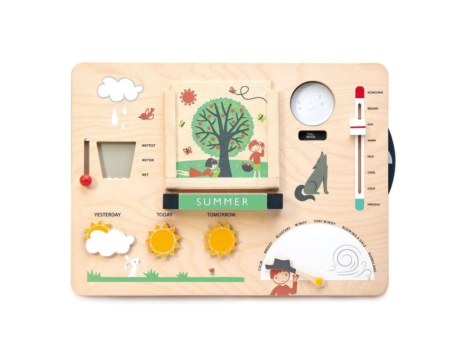 Your little one can stay on top of the forecast with the Weather Watch board! A weather station that links all aspects of climate into a simple and educational board that can be hung up on a classroom wall or played with on a tabletop, there is truly so much to learn! With the ability to keep tabs on rainfall, wind speed, temperature, seasons and moon phase, little ones will truly feel like real life weather reporters as they monitor the weather each and every day!