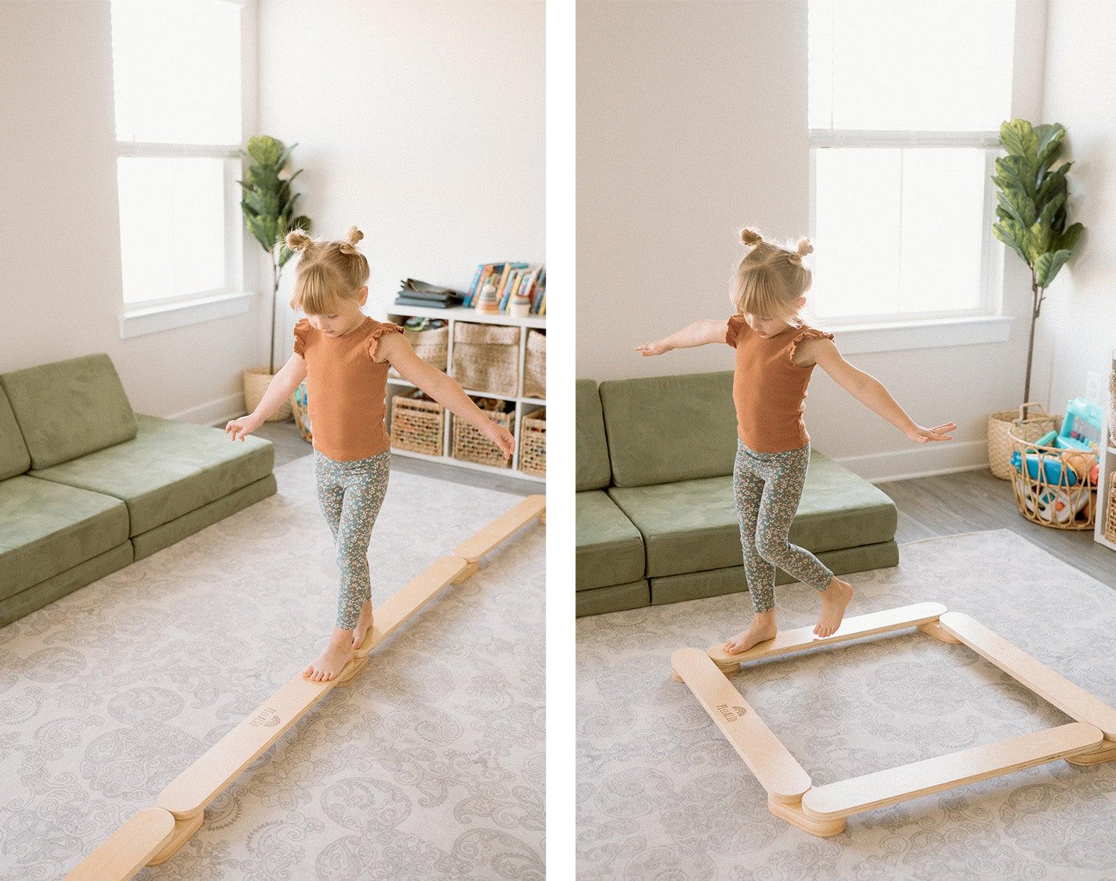 This Montessori inspired low Wooden Balance Beam is designed to help with balance and coordination. Including 4 beams with 5 connectors, this set allows your little one to use their playtime imagination and creativity as they build different shapes with the beams to practice walking and balance!